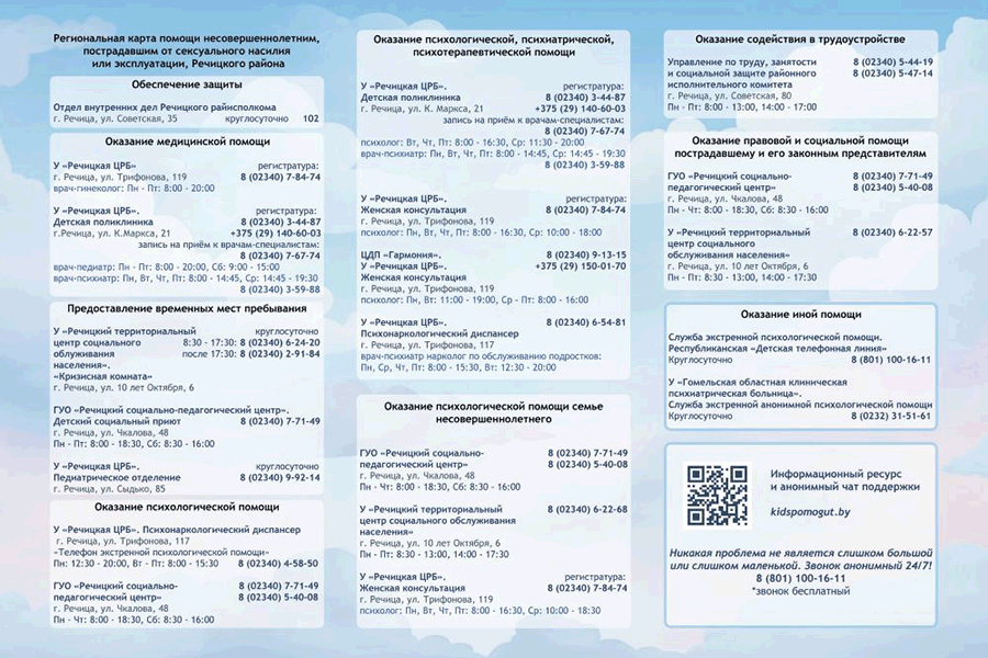- «Республиканский центр психологической помощи» 8-017-300-10-06 (будние дни, с 8:30 до 17:30).